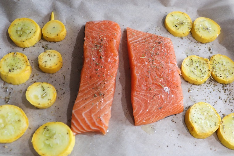 - Season the salmon with salt, pepper, garlic, and parsley.